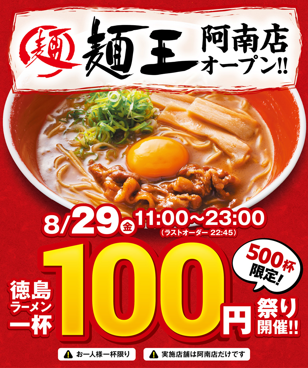 徳島県阿南市に「麺王 阿南店」がNEWオープン!それを記念して徳島ラーメン100円祭りを開催します!